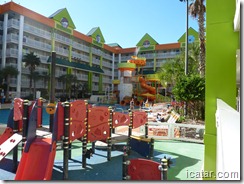 bedrooms for the kids and parents. The kids’ room was decorated with SpongeBob wallpaper, and Nickelodeon characters greeted you everywhere you went on the grounds. There were two giant heated pools, complete with massive water slides and other assorted activities.